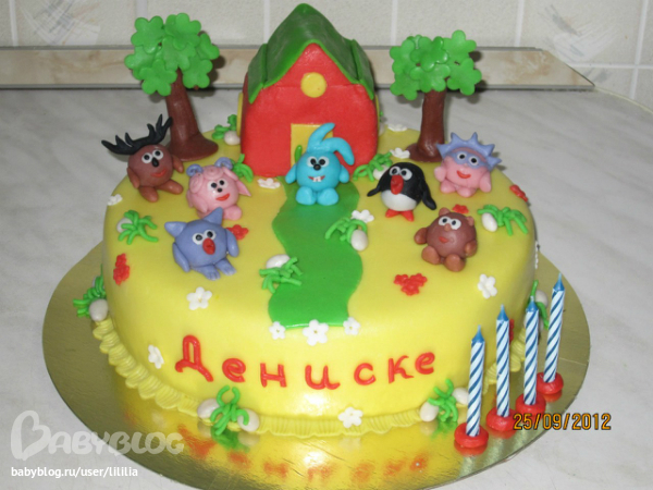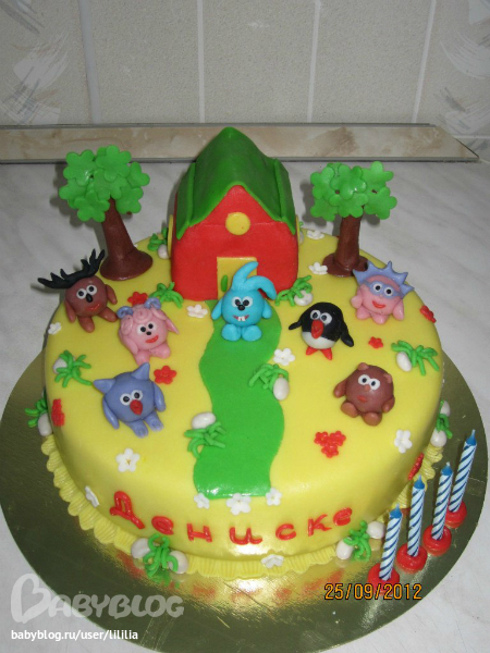 Торты детскиеТоже второй тортик со Смешариками. Ванильный бисквит, начинка персики, крем сгущеночный. В домике медовик. Вес 2,9 кг. Работа сестры.