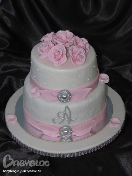 Нежный тортик!!! Брошечки(пряжечки) интересно сделала!!! А можно мне тоже рецептик, как чиз под мастику делаешь?
