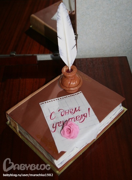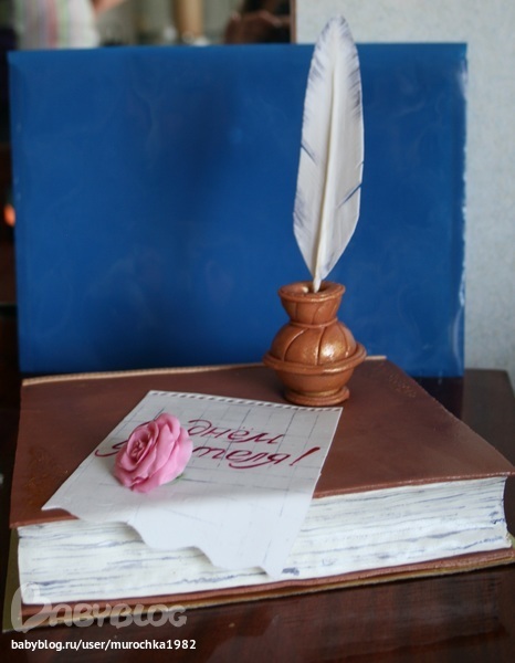 Торты тематическиеМой 5-й мастичный тортик))) Внутри молочная девочка, сверху мастика из малютки; перышко, листик и розочка из . Две ночи сидела над ним, и, в принципе, довольна результатом, единственное, не могу никак добиться металлического плотного блеска от кандурина, хотела чернильницу медную блестящую сделать и орнамент на книге при помощи золотого канудрина, но блеск еле заметный, на книге вообще почти не читается рисунок. На чернильницу сухой порошок кистью напыляла, а орнамент на книге тонкой кисточкой вручную рисовала густо разведенным в водке кандурином, но оба способа не дали желаемого результата. Девочки, как вы сним работате, что у вас всё так здорово блестит?