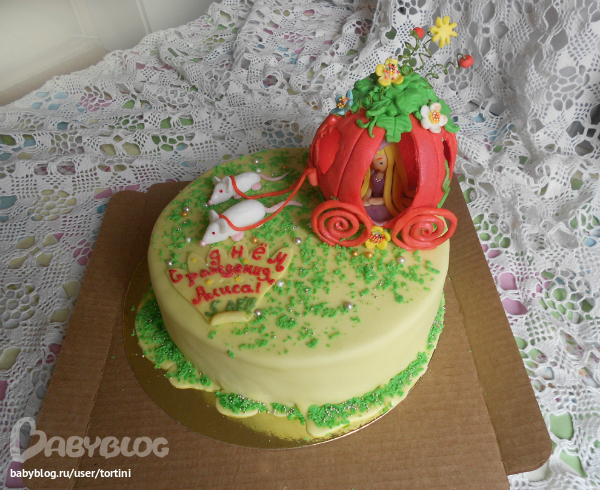 карета очень легко делается, находите мячик подходящей формы (можно и что-то другое, но у меня был мячик) обтягиваете его мастикой, вырезаете отверстия - окошки, веревкой размечаете полосы, сушите, потом когда немного подсохнет, разрезаете напополам, чтобы карету можно было снять с мяча... сохнет еще несколько дней и все, снимаете, склеиваете, украшаете...)))