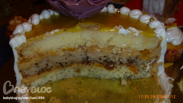 Торт "Сказка" (коржи с маком, с орехами и с кокосовой стружкой), крем-брюле(сливки+вар.сгущ.), персики.Украшен мокрым безе.Вес-1.6 кг.