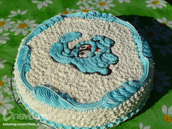 У нас рюшечек и не будет(так же как и цветочек, бабочек и сердечек) )). Я попросила просто голубую окантовку по краю и голубые банты по бокам, ну и надпись. Марципанового у них нет к сожалению, так что начинаю склоняться к сливкам...