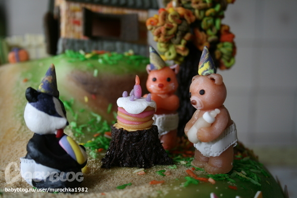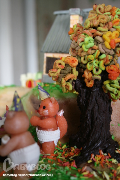 Спасибо большое. Мне трудно сказать сколько времени ушло, работала когда сыночек и домашние дела позволяли, в основном ночами. Если все часы сложить наверное около 3 суток наберется,ну а вообще примерно на месяц я это мероприятие затянула: В одну ночь мишку сделаю, в другую домик раскрою и вырежу. На одного звереныша в среднем 4 часа уходило, хотя казалось бы что там лепить, два шарика и четыре колбаски)))))))) Два дерева потеряла в прцессе, поставила на восточное окно ночью (забыла мозг включить), а утром была шоколадная кашка((( Я только начала тортиками заниматься и клиентов пока нет практически, так что могу позволить себе покапаться)))