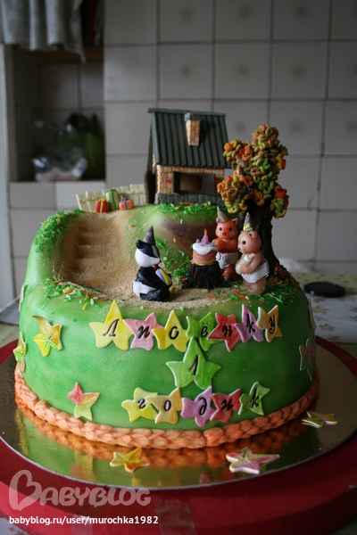 Торты детскиеМой первый сюжетный тортик на день рожения сыночки! Лисенок- это он и есть, потому что глазёнки хитрющие, как у мамы лисы))) Вес почти 4 кг. внутри:ванильный шифон и 2 крема из белого и молочного шоколада, снаружи марципан. Дерево и пенёк-шоколад, звери- марципан, домик- желатиновая мастика.Помоему поучились неплохо ;-)