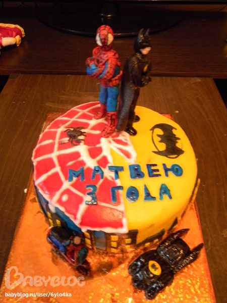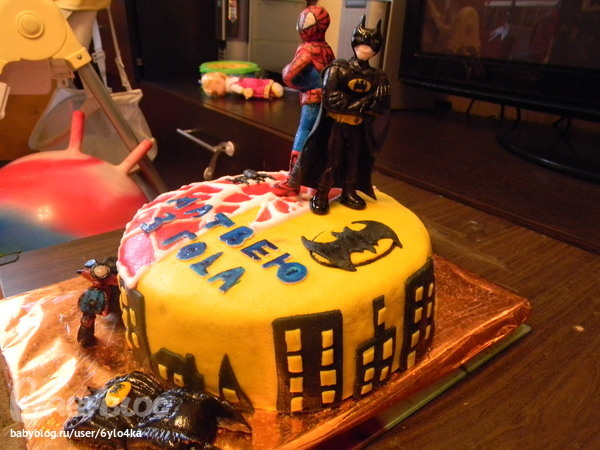 Торты детскиеСразу прошу прщения за фон, все бегом бегом и пока дочка не добежит до торта (мы поняли всю прелесть бисквитов, крема и мастики). Внутри сметанные коржи, сливочно-творожный крем с вишней и бананом, вес 3 кг. Намучилась я конечно с бэтменом, никаак стоять не хотел, ноги не выдерживали веса туловища, в итоге стооял сушился у меня в разных позах)))) выход все-таки нашелся , сушился на трех шпажках: 2 в ногах одна в туловище, (прямо жертва Влада Цепеша извините за сравнение), да и ниже ростом человека паука ( ну в конце концов кто их вместе видел?)))).