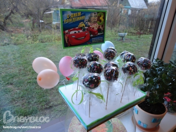 . Так ждала ее звонка, вся испереживалась)) Вес не знаю. Нижний ярус "три шоколада", верх "молочная девочка" со сливочно-творожным кремом и ананасами. В "маквине"- картошка. В подарок еще делала кейк попсы на подставке. Вот такие.
