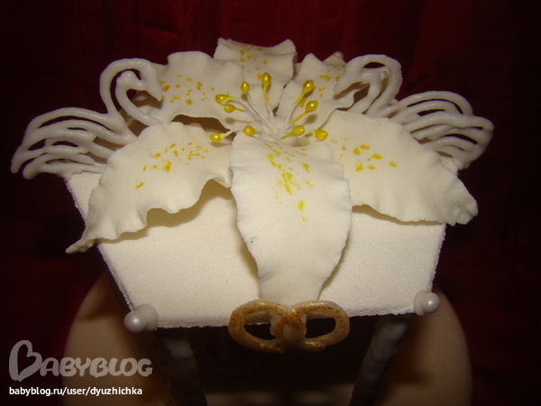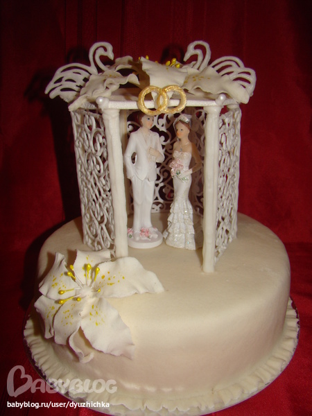 Беседку надо бы повыше было или жениха с невестой поближе, их плохо видно... Да и лилия наверху осела... Вид сверху нормальный, а спереди - пустовато...