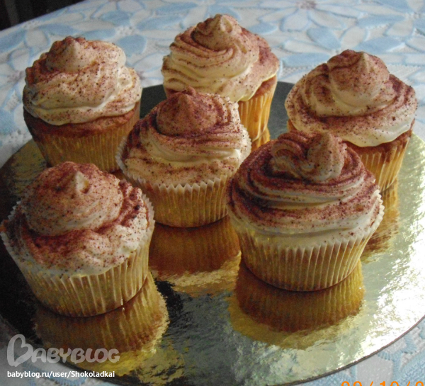 Пропитываем остывшие кексы кофейным сиропом, сверху выкладываем крем (из конд. мешка или ложкой).