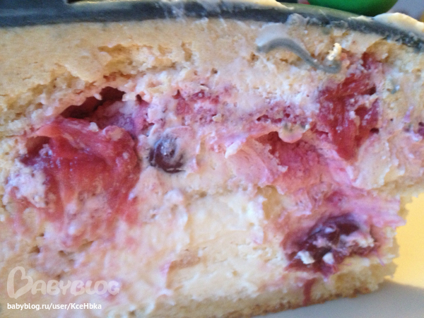 Начинка: ванильный творожно-сливочный крем с профитроли, наполненными перетертым с сахаром и лаймом фейхоа (настоящий кладезь йода и витаминов); маскарпоне с вишней, взбитые сливки с клубникой.