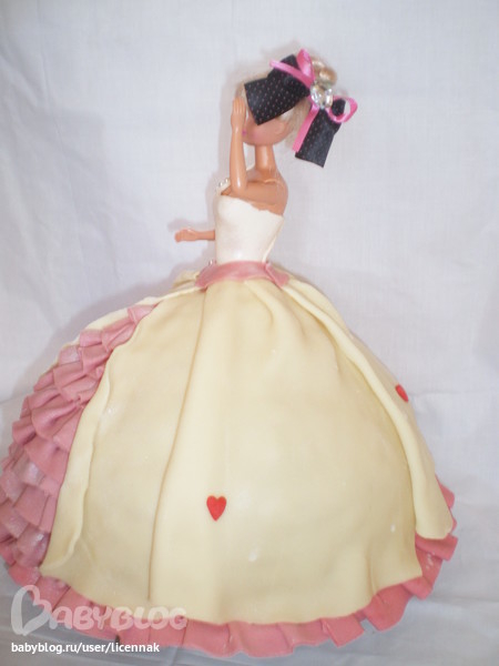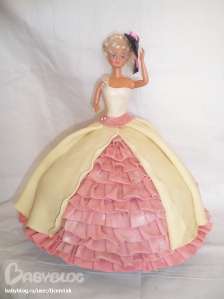 Торты детскиеОн большущий такой и вкусный))) Внутри апельсиновый бисквит, шоколадный бисквит(масляный), карамельный баварский мусс и апельсиновый джем с корицей) Качество фото не очень, день пасмурный, серые полоски на юбке на самом деле перламутр, просто на фото выглядит фигово(((