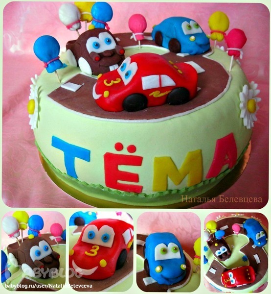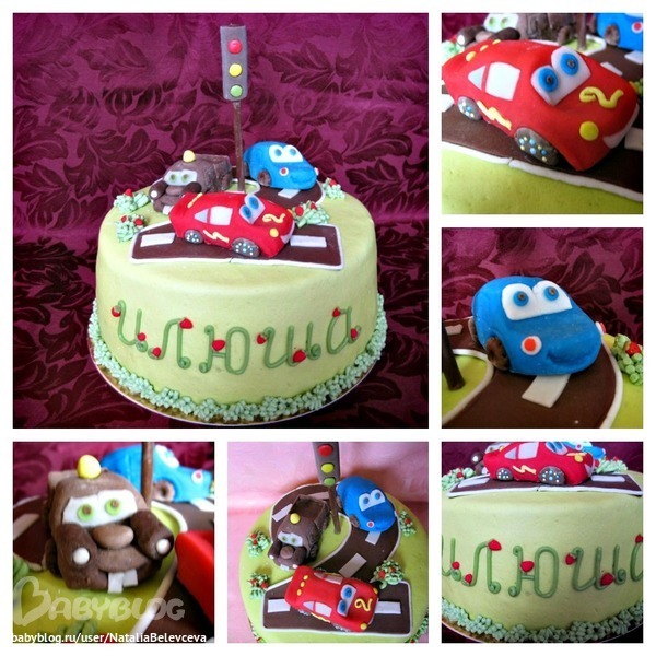Торты детскиеБисквит на кипятке, йогуртовое суфле, апельсиновое желе, банан, киви. В машинках - пирожное картошка с миндальными хлопьями