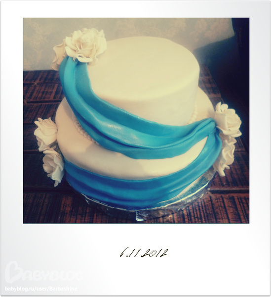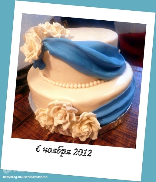 Была задумка,сделать на торт копию здания из айсинга,даже чертеж сделала,но времени мне как всегда не хватило. Сразу решила,что торт будет в цветовой гамме храма. Как было приятно увидеть,что голубой получился точно как цвет стен,а сам храм был весь украшен белыми розами. Правда помяла я его беднягу,пока везла,да и часа 4 он без холодильника провел. Поэтому,когда я начала его резать(представьте меня заставили это делать!!!!ааааа!!!!) он прям весь проминался
