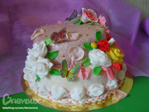 А этот делала для мамы подружки, подружка просила кучу цветов, бабочки,занавеску и т.д. Мне лично кажется,что много лишнего! Нижний ярус - ванильный бисквит,банановый мусс,прослойка - миндальное пралине с вафельн.крошкой,пропитка-пломбир, маслянный с печеньем; второй ярус - шоколад на кипятке,заварной крем,пропитка кофе с молоком, ганаш.