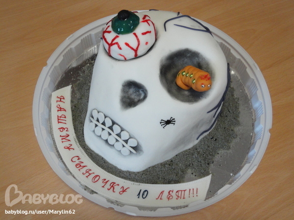 Делала по присланной картинке. Там, откуда картинку взяли, такой торт стоит 11400 рэ (3800 р/кг, 3 кг). , червяка просили, чтоб торчал из глаза. Поэтому я сделала такой, который соответствует моей цене) по-моему справедливо)