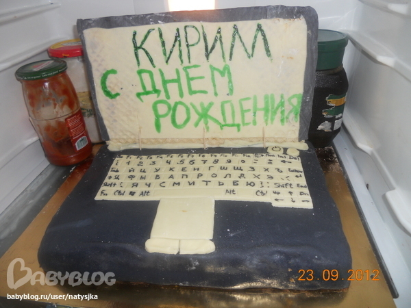 ВОПРОСЫ кондитеровОдним из первых тортов на заказ был ноутбук, который я с треском провалила, мало то что спешила крышка падала и за час пришлось сообразить что нибуть, позвонила заказчице мол приезжайте смотрите будете забирать забирайте нет оставляйте, денег попросила только за использованые продукты. она забрала а потом еще и звонила чтоб я не переживала они крышку сняли а сам торт всем понравился и просто вкуснятина, а я зареклась никогда больше не делать торт ноутбук тем более со сникерсом.