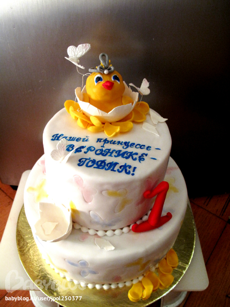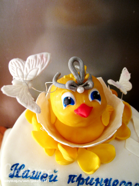 вот так и я часто - рука не поднимается испортить торт надписью, единицы тоже не люблю втыкать))) цыпа прелестна, диадемка ее не портит))) но надпись...