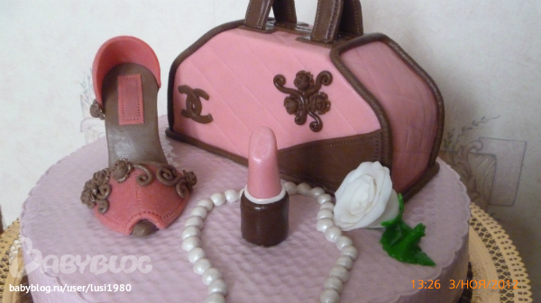 А это торт для девушки на 21-летие. Внутри-низ:шокошифон, сливочно-творожный крем, вишня, пропитка крем-брюле; сумка:ванильный бисквит на кипятке, крем-брюле, персики. Общий вес-3.8 кг.