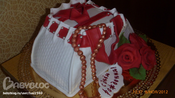 Торт-сумка( моя первая, "отдельно стоящая").Заказала знакомая для мамы мужа. Внутри: шокошифон, сливочно-творожный крем, вишня. Вес-2.2 кг.