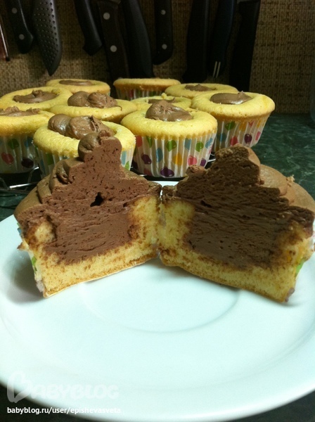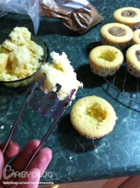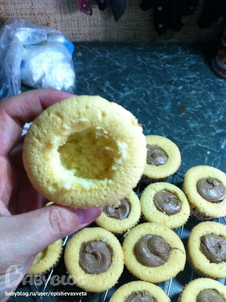 я внутри сделала дырки по твоему рецепту )) и положила клубничный джем, потом сфоткаю в разрезе,хотела с вареной сгущенкой сделать,а оказалось что в холодильнике у меня она стоит полупустая,всего 1ст.л. в ней,зато джема дофига было и решила с ним.У меня еще не очень получается с мешком кондитерским,как-то побаиваюсь его он у меня совсем древний,но для первого раза ооочень довольна,вот сижу сдерживаю себя чтоб не пойти схомячить их,буду ждать вечера и нападу ))