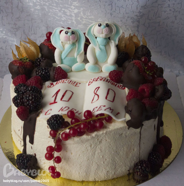 Не все любят мастику. Выравнивание - взбитые сливки, украшен свежими ягодами, шоколадом и мастичными фигурками.