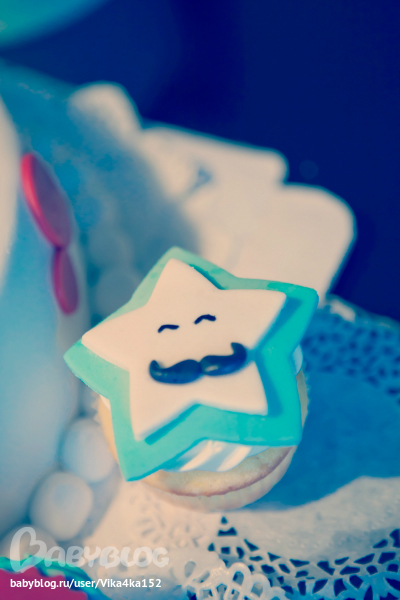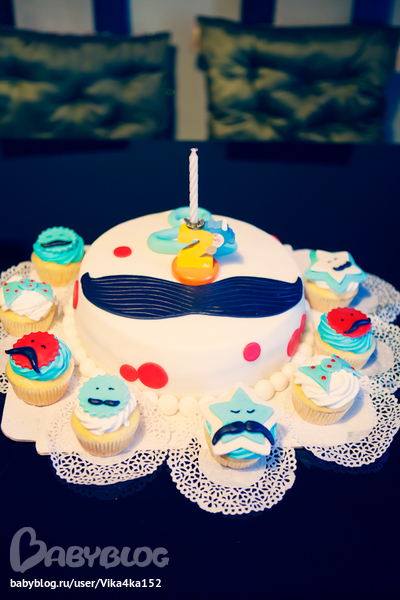 в это раз решили сделать ему небольшую тематическую вечеринку с модными усами. Для этого заказали торт, капкейки с усами, нашили их на боди, вырезали их из картона и немного пошалили.