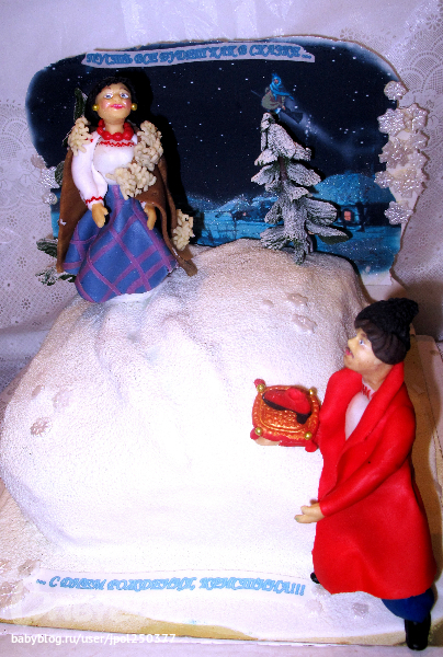 ПУСТЬ БУДЕТ ХУТОР И МНОГО СНЕГА, ХАТЫ , ВАКУЛА,ОКСАНА , ВЕДЬМА И ЧЕРТ. ЕСЛИ ПОЛУЧИТСЯ ТО МОЖНО СДЕЛАТЬ КАК ЧЕРТ ВОРУЕТ МЕСЯЦ В КАРМАН. И НАДПИСЬ : ПУСТЬ ВСЕ БУДЕТ КАК В СКАЗКЕ. СДНЕМ РОЖДЕНИЯ, КРИСТИНА ))))