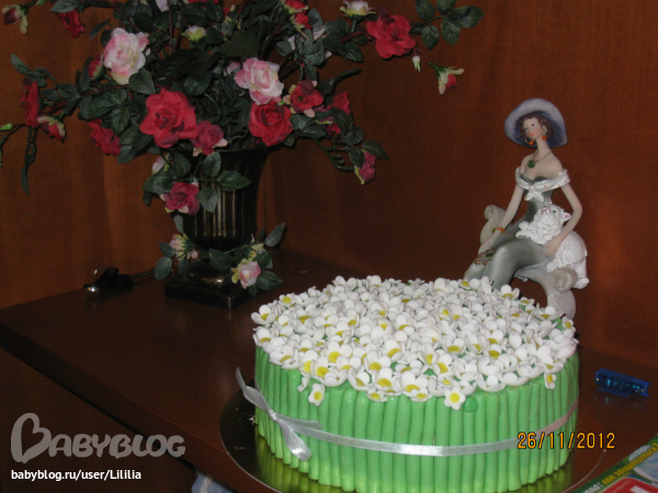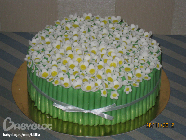 А с мелкими цветочками делала тортик для тети мужа. У нее вчера был ДР. Внутри зебра, ананас, брусника и заварной крем, взбитый с маслом и вареной сгущенкой. Заборчик надо было поменьше делать, чтоб цветочки сверху свисали больше, только после сборки сообразила!!! Вес около 2,5 кг.