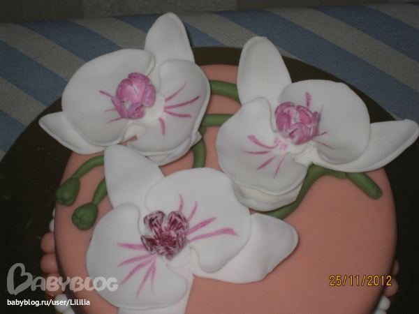 Торты для женщинМоя работа. Тортик с орхидеями заказала подруга свекрови для начальницы своей. Сказала, что та любит белые орхидеи, вот и пришлось "сотворить". Нашла на просторах инт-та схему лепестков. Но слишком большие сделала для такого маленького тортика)) Да еще и сухих красок у меня нет, поэтому покрасить удалось только так. Внутри ванильный бисквит, ананас, крем-брюле. Вес около 1,5 кг.