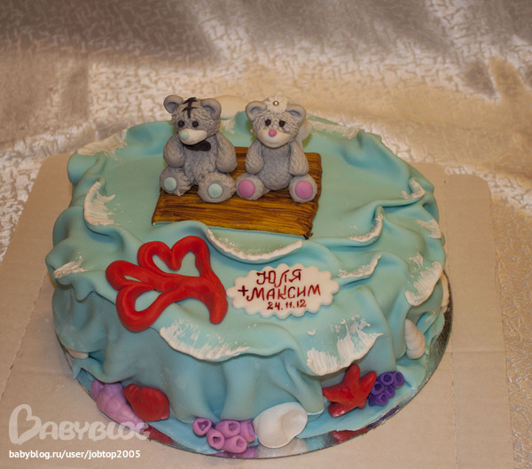 Торты свадебныеПредыстория такова: молодожены отмечать свадьбу не хотели, вынудили их друзья, отмечали в сауне. ТОрт тоже был заказан друзьями. Чтобы было много воды, жених и невеста - мишки, и никаких роз-орхидей. И пустили мы из по бушующему морю-океану в далекое и счастливое плавание.