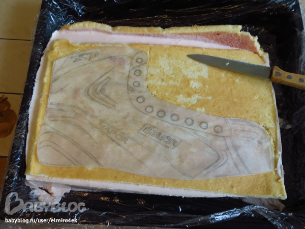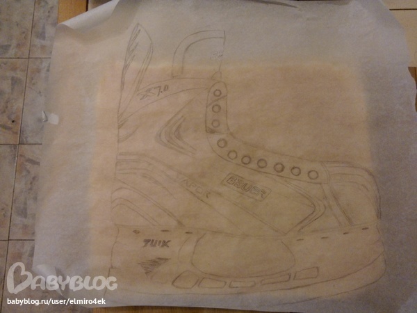 Учитывайте то, что во время обмазки торта ваш конек немного вырос в объемах из-за лепильной массы, поэтому когда я прикладывала кальку, контуры ботинка и рисунка уже не совпадали. Когда будете вырезать детальки по шаблону, делайте припуски на загибы мастики с учетом высоты торта.