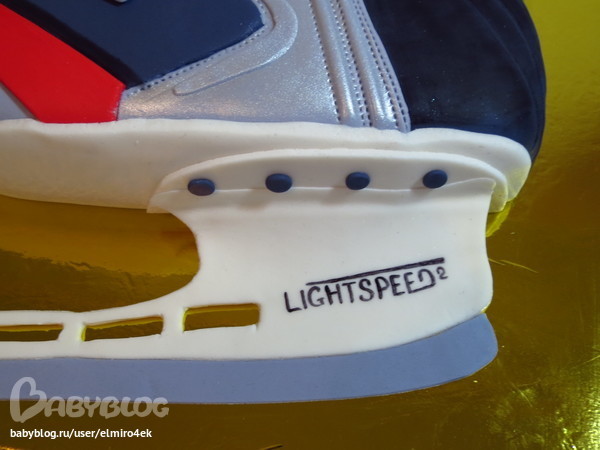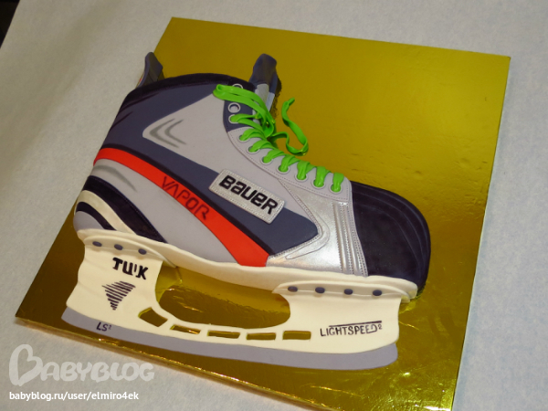 На отдельном кусочке мастики пишем название бренда "BAUER", серебрим кандурином и делаем строчку (к коньку клеила в последнюю очередь).