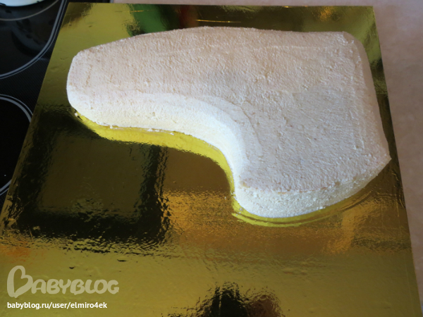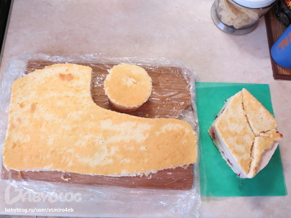 Прикладываем макет к нашему собранному и застывшему торту и обрезаем. И тут я поняла, что вес торта становится совсем маленьким (много срезается), видите, это почти треть торта. А мне нужно было на 3 кг выходить. Но и делать конек более высоким тоже было нельзя, неестественно бы смотрелся. Из положения я вышла, сделав дополнения, кстати, ооочень даже нужные, и торт не смотрелся одиноко, и идея была развита.