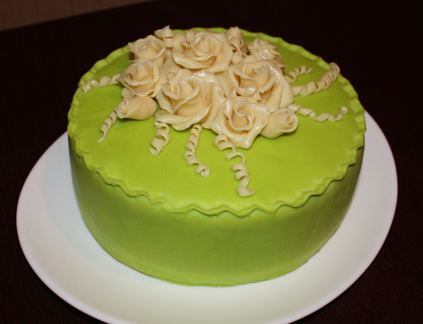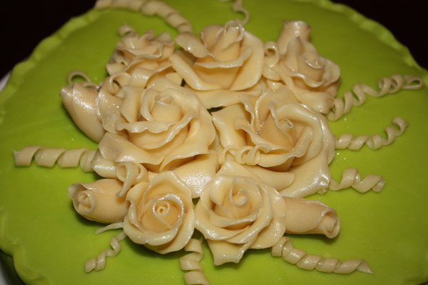 Розочки сделаны из шоколадной мастики (белый шоколад и мёд). Очень тонко раскатывается мне понравилось, слепила и в холодильник убрала.Немного подмёрзли и лепестки сформировала,очень удобно. На вкус шоколад,а консистенция как ириска- тягучая.