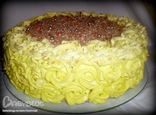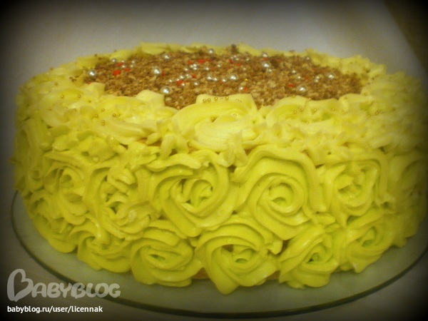 Украшение тортов кремом,шоколадом, фруктамиНу это слабо сказано про тортик, в нем 3 кило. Опробовала сливочный крем с меренгой и самодельную насадку. Правда из-за нехватки крема не так старательно и аккуратно вышло, как хотелось, учту на будущее. Внутри шифон. бисквитс пропиткой из карамельного молока, крем брюле с грец. орехом и черносливом.