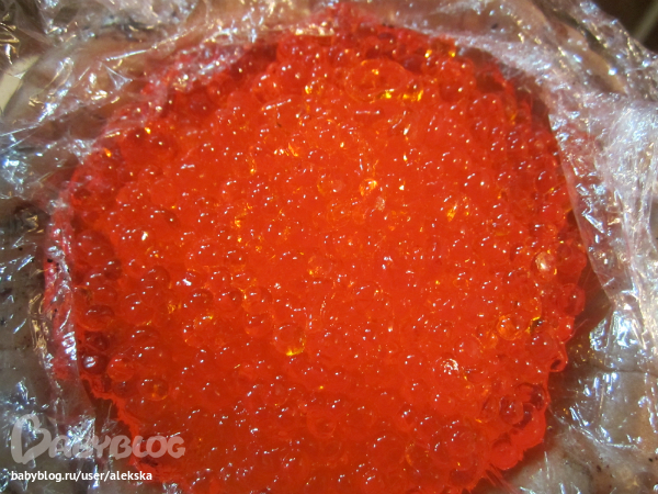 Икорка на пищевой пленке, так как предстоит 3-х часовая поездка к имениннику. А потом какое-то время без холодильника, хорошо, что в машине прохладно будет. :)))