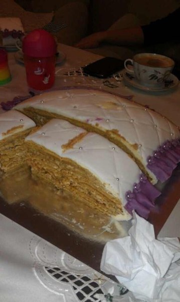 "Анна, здравствуйте)))) тортик очень понравился!!! Мастику выбирала чисто для красоты, ее потом счищать и есть сам торт. Я боялась что будет очень сладкая мастика... вы меня порадовали)))) мастика вкусная безумно. Половину торта умяли в три секунды)))) вторую раздали с собой гостям и себе конечно)))) и буквально только что я ела ваш тортик)))) внешне понравился всем, столько фотосессий и фотоаппаратов не знала ни одна топ модель)))) медовик вкусный, его ели даже те кто не любит сладкого))))"