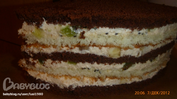 Внутри шокошифон и ванильный бисквиты, крем-брюле, киви, банан.В спешке даже не взвесила, думаю где-то 3 кг, может побольше.