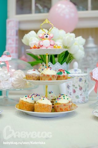 Делала на прошлой недельки капкейки банановые с клубничным вареньем на заказ. Для малышки сделала без масла и молока. Вот что получилось. Мишка и подарки из мастики)))