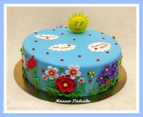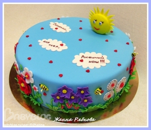 Очередная благодарность Жанее) Тортик волшебный) идея подарка Счастьем воплощена! Сижу дома с грудничком, выдти далеко не могу, и решила сделать такой подарочек мужу на ДР. Он у меня особо ценит подобные подарки в отличии от просто покупки, поэтому несказанно рад))Тортик Счастья заключался в радужности бытия, и солнышко, и лазурное небо, и необыкновенные цветочки, и много пчелок, как подводка к медовику. Много тонких коржей сделали его особенно сочным, мы в восторге!!Вот фоточка: