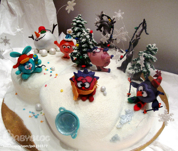 Торты детскиеПоследний оплот тепла и летней жизнерадостности рухнул((( Зима окончательно и бесповоротно пробралась на мою кухню)))))))))))))))) Увидела тут в 5 утра новую серию смешариков и загорелось мне зимний тортик сделать, благо что долго заказицу уговаривать не пришлось) вот что получилось)