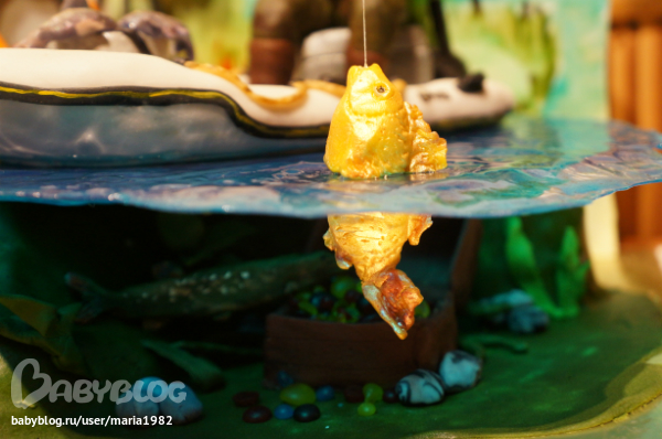 Торты для мужчинИтак, это мой четвертый Рыбак за этот месяц и последний тортик 2012 года!!!! урррра!!!!!! отдыхать мне всего два дня, но от того, что скоро отдам два последних в этом году заказа, становится как-то спокойнее, вроде как заново все начинаю :)))) В этом году я сделала свой первый тортик и более 100 после него :)))) посмотрим, что будет в Новом году :) Итак, вес 5,6 кг, маскарпоне с фруктами и крем-брюле с грецкими орешками и черносливом. Рыбака, лодку, телескоп, палатку, дом, одежду на рыбаке вплоть до штанов и шляпы лепила по фото. Заказчица прислала более 40 фотоснимков. Очень надеюсь, что тортик понравится, потому что работа была проделана очень большая. Сюжет таков (со слов заказчицы): муж ловит золотую рыбку на спининг, под водой щука охраняет сундук с сокровищами, на бережку костер, палатка и телескоп мужа, за спиной виден дом... Вообщем, вроде ничего не упустила. смотрите фотки :)) ДЕВОЧКИ, ВСЕХ НАС С НАСТУПАЮЩИМ НОВЫМ ГОДОМ!!! БЛАГОДАРНЫХ ЗАКАЗЧИКОВ НАМ И ИНТЕРЕСНЫХ ЗАКАЗОВ!!!