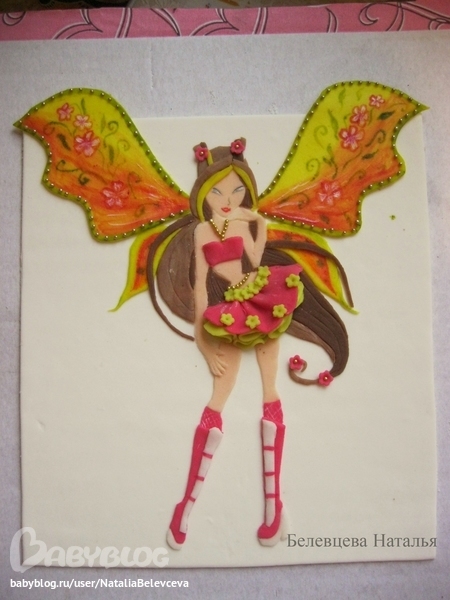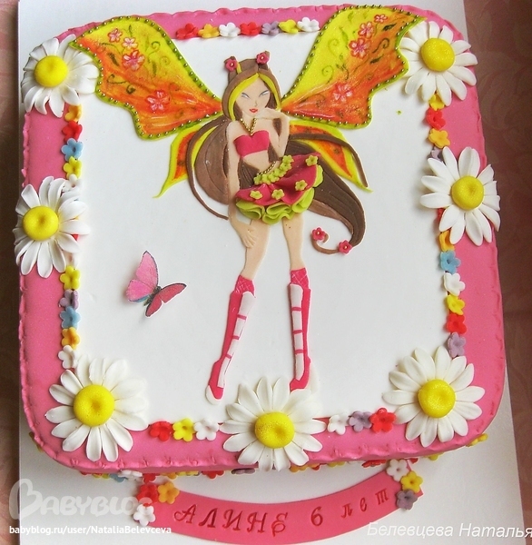 В последних числах декабря заказали мне тортик на 3-е января с винкс, я морально себя подготовила лепить фигурку, нарыла МК, но заказчица приносит фото тортика из нета, а там ....... вафельная картинка, я ей предлагаю сделать куколку, а она - нет, хотелось бы вот так) картинку я уже заказать не смогу, решила сделать аппликацию. Чтобы облегчить себе задачу 3-го числа, я сделала ее заранее на кусочке белой мастики, вот что получилось