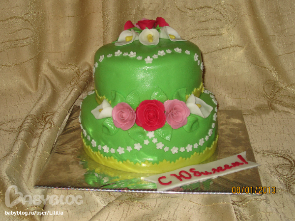 Торты юбилейныеПоследние совместные работы с сестрой. Год у нее начался с больших заказов, один тортик заказывали сестры на день рождения мамы, а второй (зеленый) жена мужу на юбилей заказала. Желтый тортик весом 4 кг. Внутри ванильный и шоколадный бисквиты, ананас, персик, киви, клубника и суфле. В зеленом было 5 кг. Внизу генеральский тортик, наверху белый бисквит, ананас.