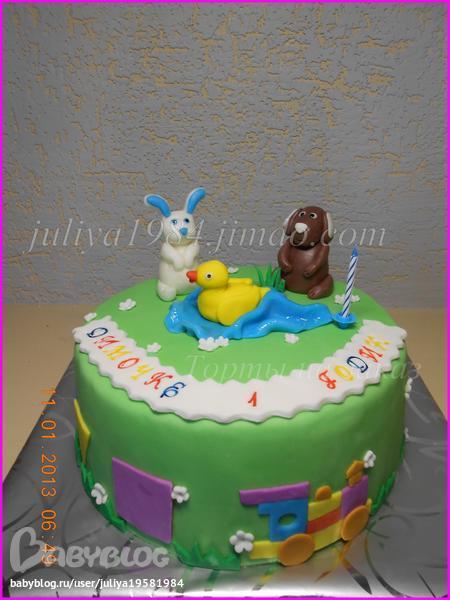 Торты детскиеЗа основу взять тортик нашей ББчки Анны. Фигурки клиентка попросила именно этих зайку и собачку, так как сыночка у нее их узнает. Внутри "Молочная девочка" с персиками. Вес - 2,7 кг. Странно на фото смотрится что тортик не ровный в районе паравозика, хотя все было ровненько(((