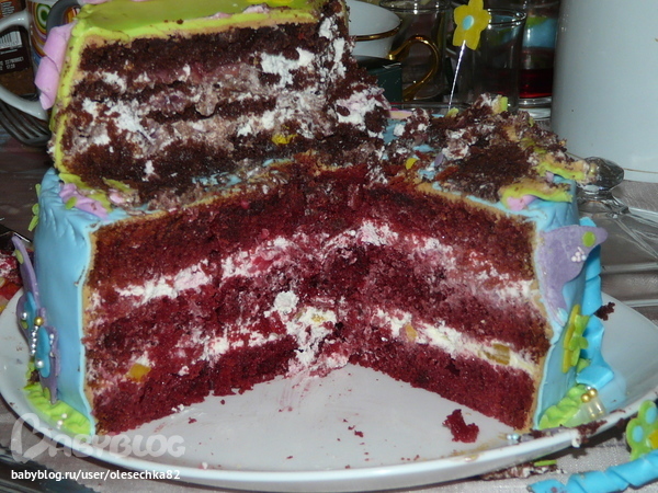 Торты детские3700кг. Низ - красный бархат с манго и малиной,верх - шококипяток с вишней.Крем сливочно-сметанный.