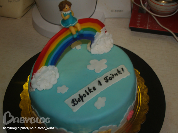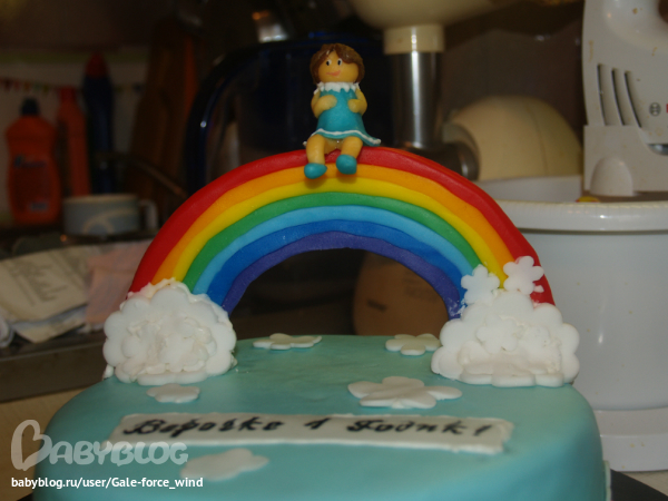 взгляд остановился на радуге. - итересно сделан. очень не люблю темные надписи на тортах, ну праздник же!- белый, желтый лучше всего красный . а как девочка дежится?