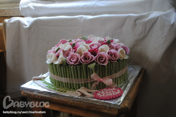 Какое счастье, что сам торт хотя бы был готов!))) Я возвращаю мужа, который уже практически уехал по делам, и мы начинаем! Работаю я со своей мастикой, покупной у меня нет. Первый раз разогнула спину я и оторвалась от стула в 16 часов, когда торт был полностью готов! Мы это сделали! Спасибо мужу, который и мастику готовил, и раскатывал, и вырезал кружочки. А я только лепила лепила и лепила розочки))).