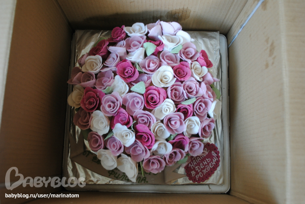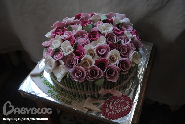 Заказал мне его родственница, которая приехала полгода назад из Екатеринбурга работать в Москву. Заказала не для себя, а по просьбе своей подруги, которая осталась в Екатеринбурге, для другой подруги, которая тоже теперь работает в Москве. Вот так витиевато))). Я предложила им несколько вариантов тортиков на выбор, но очень надеялась, что они выберут именно этот вариант. Уж очень мне хотелось его сделать!) Слава богу выбрали они именно его! За два дня до срока я начала делать розочки. Сделав штук 25, я поняла, что делаю неправильно. Розочки сильно высыхают, а это значит, что я НЕ смогу их уместить на тортике плотно друг к другу. А это значит, что торт НЕ будет похож на настоящий букет. Я испекла и собрала торт и решила что за день до отдачи я сразу налеплю все розочки и сразу плотненько украшу ими торт.