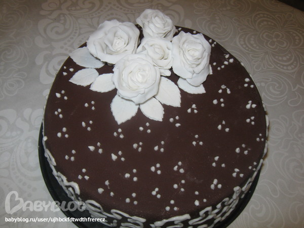 Проба пераПолучился у меня торт коричневый как я хотела, всем спастбо кто помогал советами! Делала для пробы себе, розы не очень получились не дала им высохнуть и все помяла и от крахмала чуть блики увидела через фотик, так не было. Зато покрыла в первый раз без единой складочки по-бокам-ЕСС!