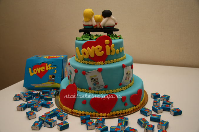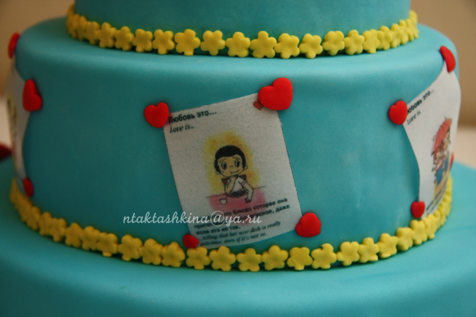Создавался он для тематической свадьбы в стиле Love is. Было много волнения, спешки с печатью вкладышей (спасибо добрым людям на форуме, которые помогли) и вот ОН! мой первый : первый 3-ярусный, первый с лепкой человечков, первый с пищевой печатью!